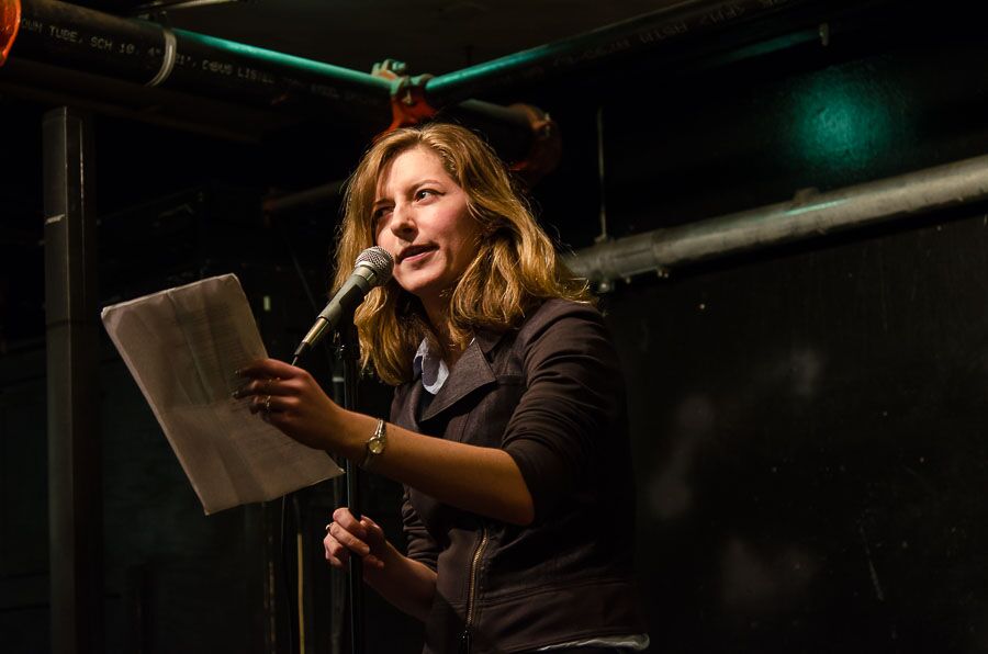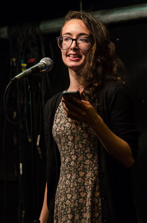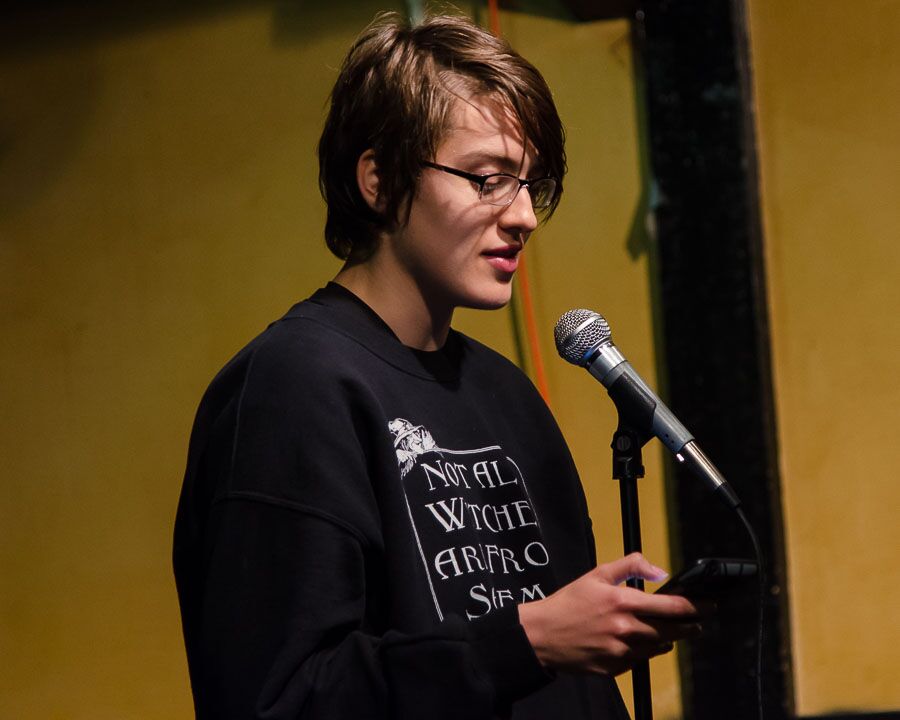 - Jess Riz, pizza pi press curator, reads during the open mic. Photo by Rich Beaubien.