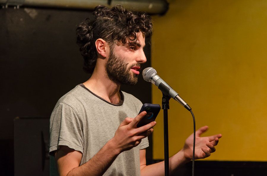 - Josh Elbaum takes the stage to sacrifice for the open slam. Photo by Rich Beaubien.
