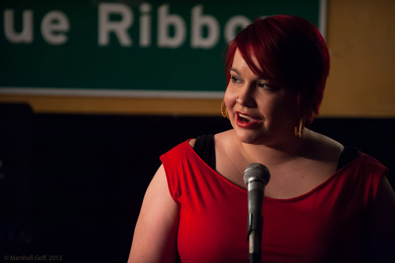 Wednesday’s slam started off with a double-barreled bang, as Sam Teitel kicked in the door with an open letter to New York City in the voice of the city of Boston, followed by Meaghan Ford’s Medusa Weeds Her Rock Garden. The two persona poems in a row were a prelude to the theme of night, during which seven of the twelve performers would give voice to at least one fictionalized character. The next poet, Ed Wilkinson, started another trend with the snarky Toast: A Political Poem, being one of five poets to take to the stage that night with paper (or iPad) in hand. All the performers seemed effectively tied in the judges’ minds until Sophia Holtz, speaking in the voice of a hundred-year-old disaster, riveted the crowd with her quietly intense performance and pulled the scores up by nearly a full point to set the rest of the show off and running.