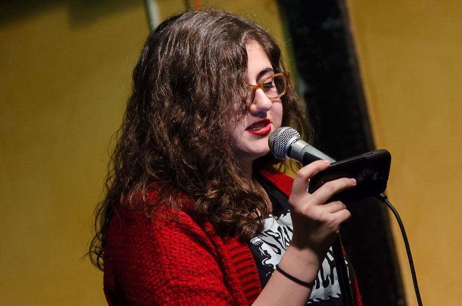 - Jess Riz, pizza pi press curator, reads during the open mic. Photo by Rich Beaubien.